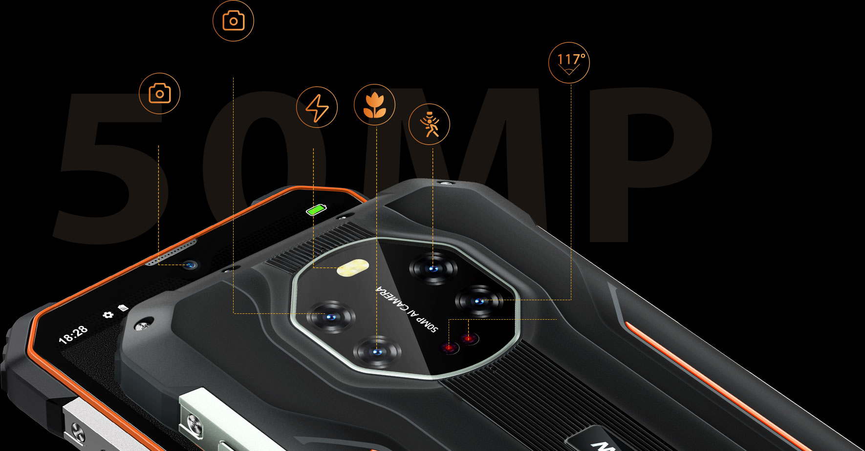 В Blackview BL8800 установлена передовая система камер высокой чёткости с сенсором 50Мп с ИИ, ИК камера видит в полной темноте, камера с углом обзора 117°, камера глубины резкости. Система камер позволяет снимать и днём и ночью, на свежем воздухе и под водой.